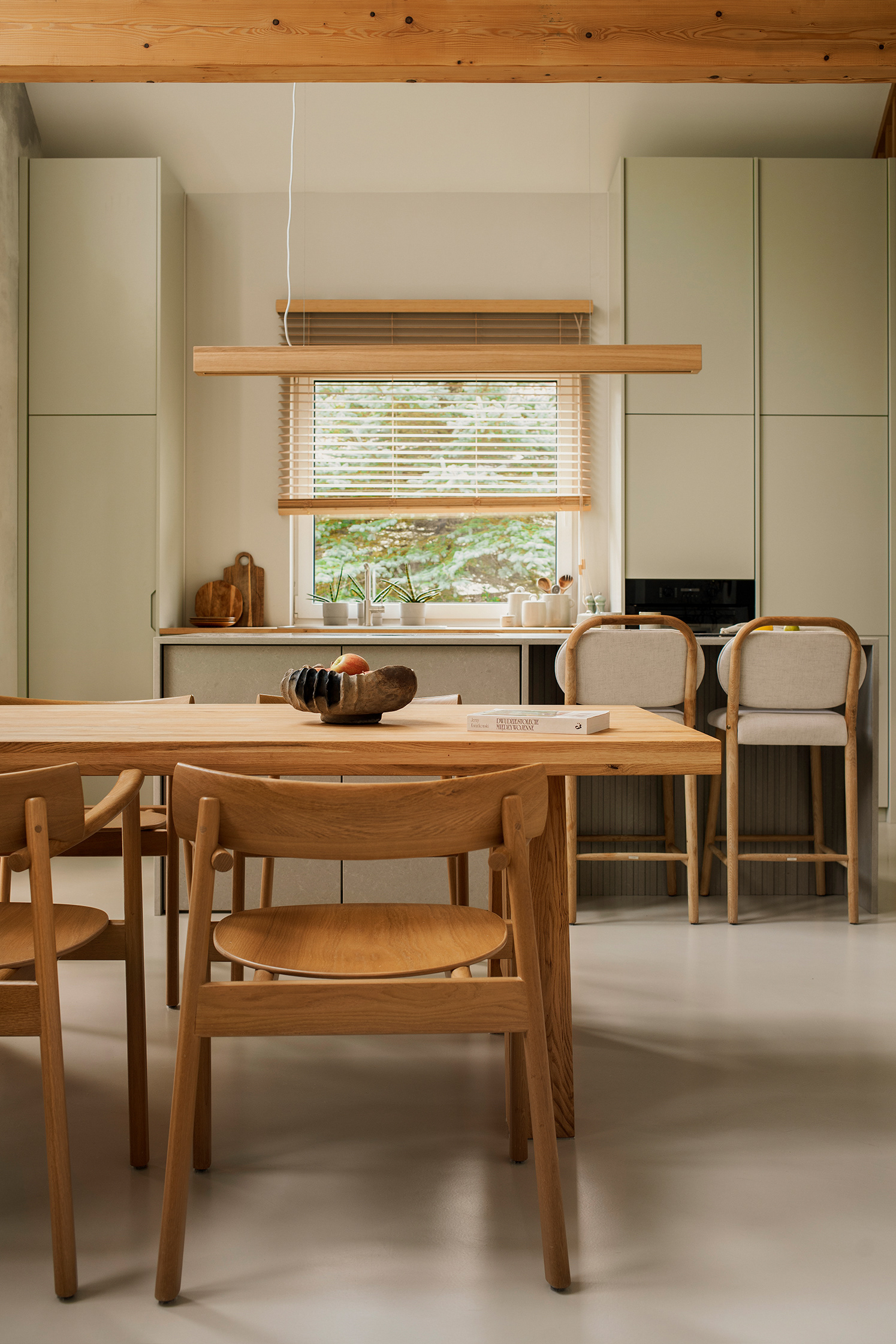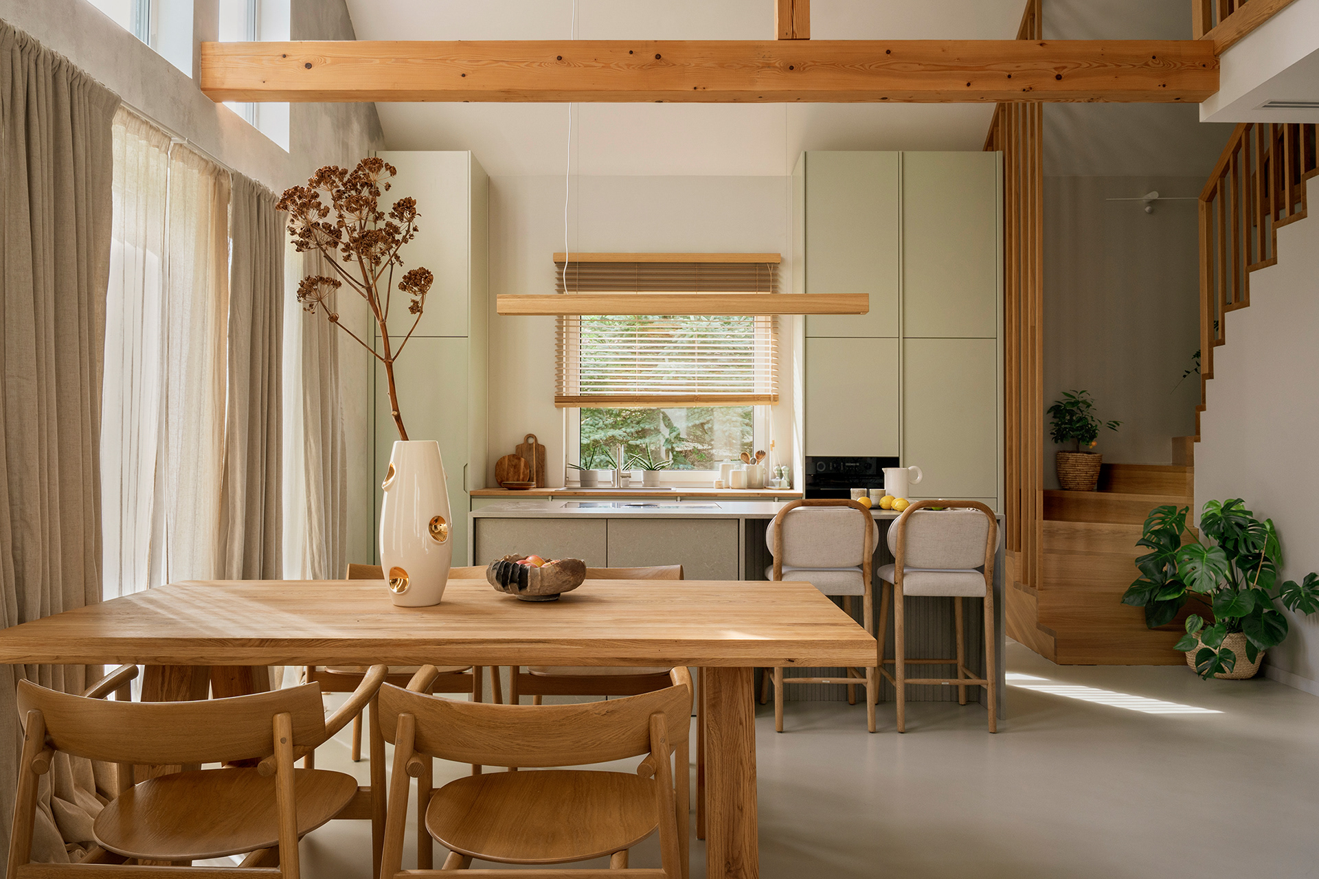 The interior design of this house in Masovia, specifically in Osowiec, was born from the need to create a space in harmony with its surroundings. From the beginning, both I and the clients wanted the interior to reflect and interact with the natural environment - hence the use of natural materials such as wood and stone, complemented by neutral tones and shades of green referencing the landscape outside.