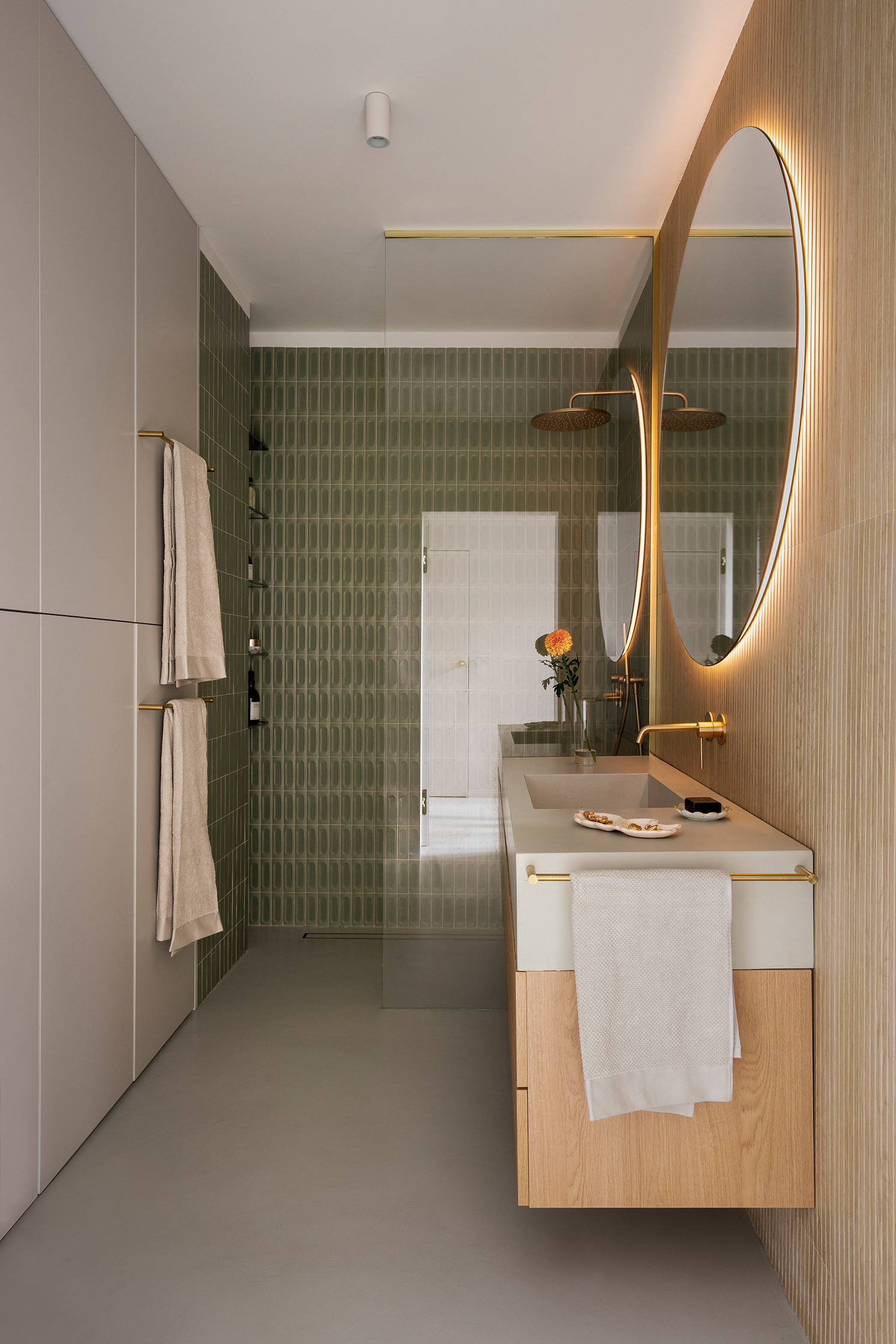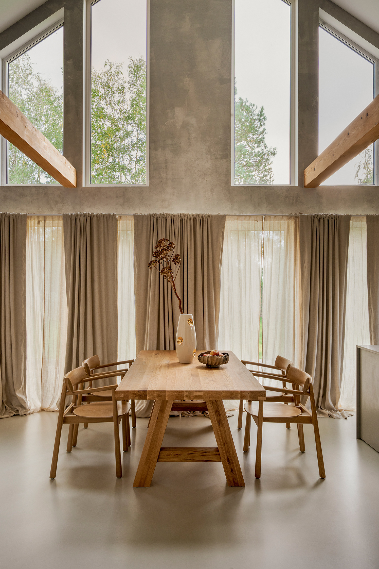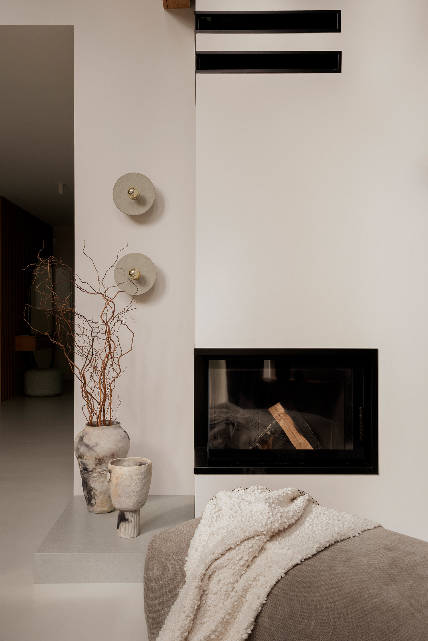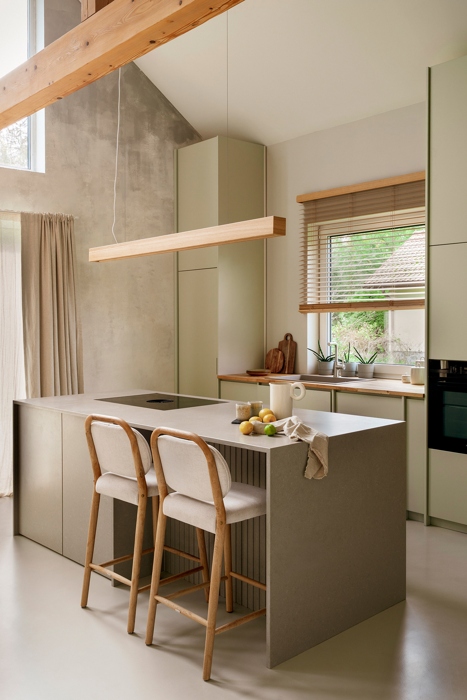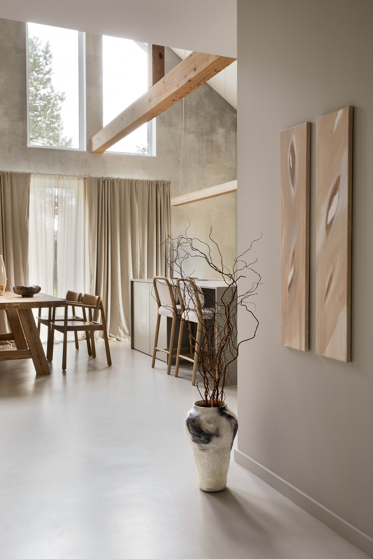 The aesthetic was inspired by wabi-sabi as well as the clients’ love for travel. Even before the design phase began, the client had collected a handcrafted tableware set during her holidays, which turned out to perfectly match the character of the home. These types of details bring authenticity and a personal dimension to the space. The design is completed with microcement flooring and a textured plaster wall framing large windows.