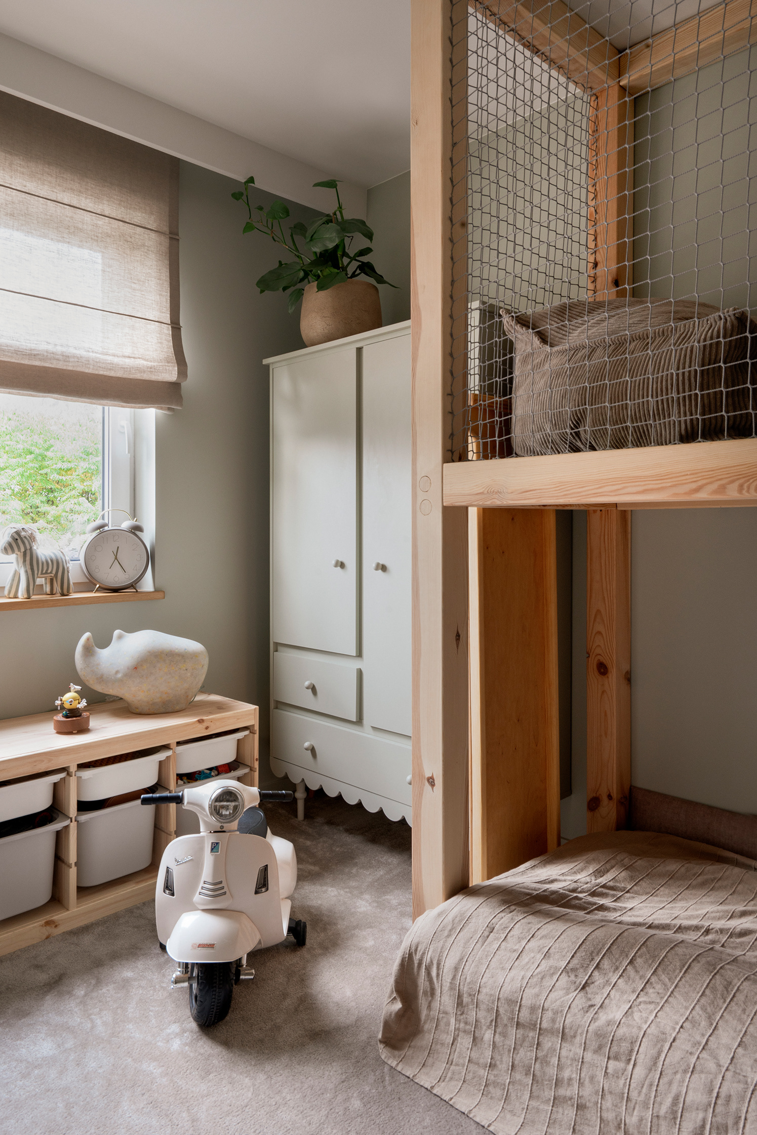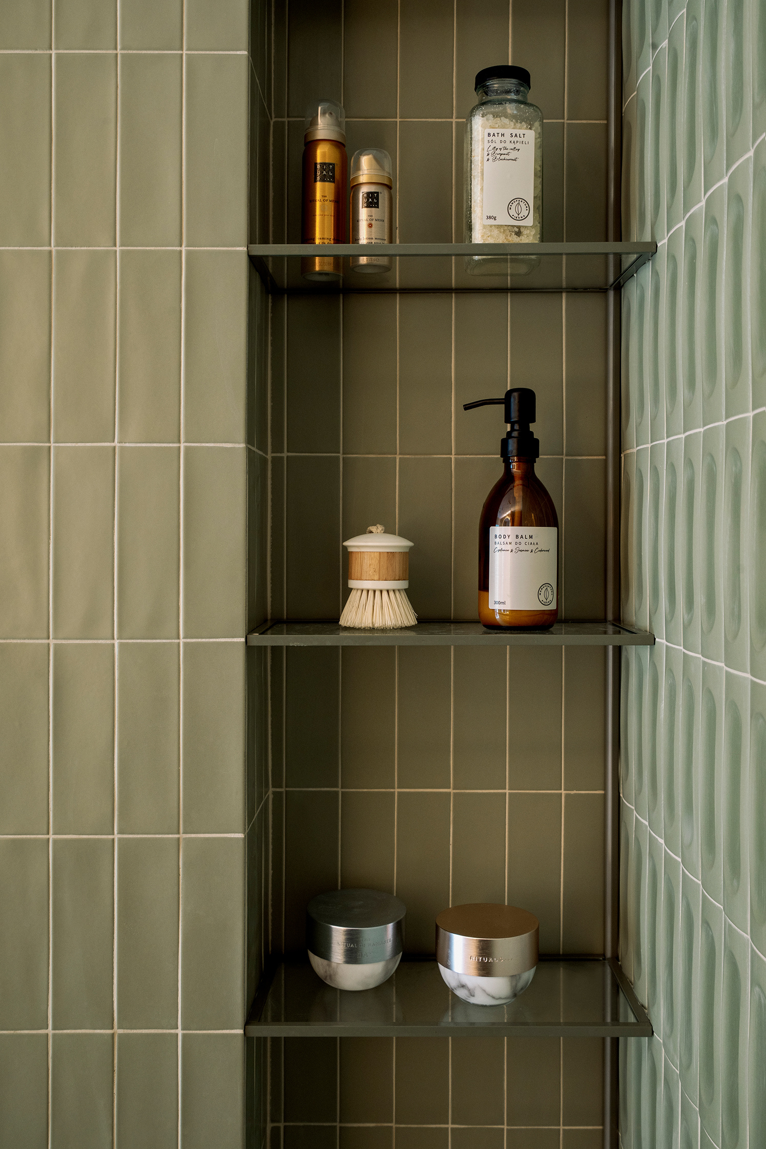 The clients were open to bold solutions - such as a kitchen in a color that may appear classic at first glance but brings depth, or green tiles in the shower area. One of the main design challenges was creating a staircase to the mezzanine, as it was not included in the original architectural plan. The final structure, made of solid oak wood, integrated seamlessly into the home.