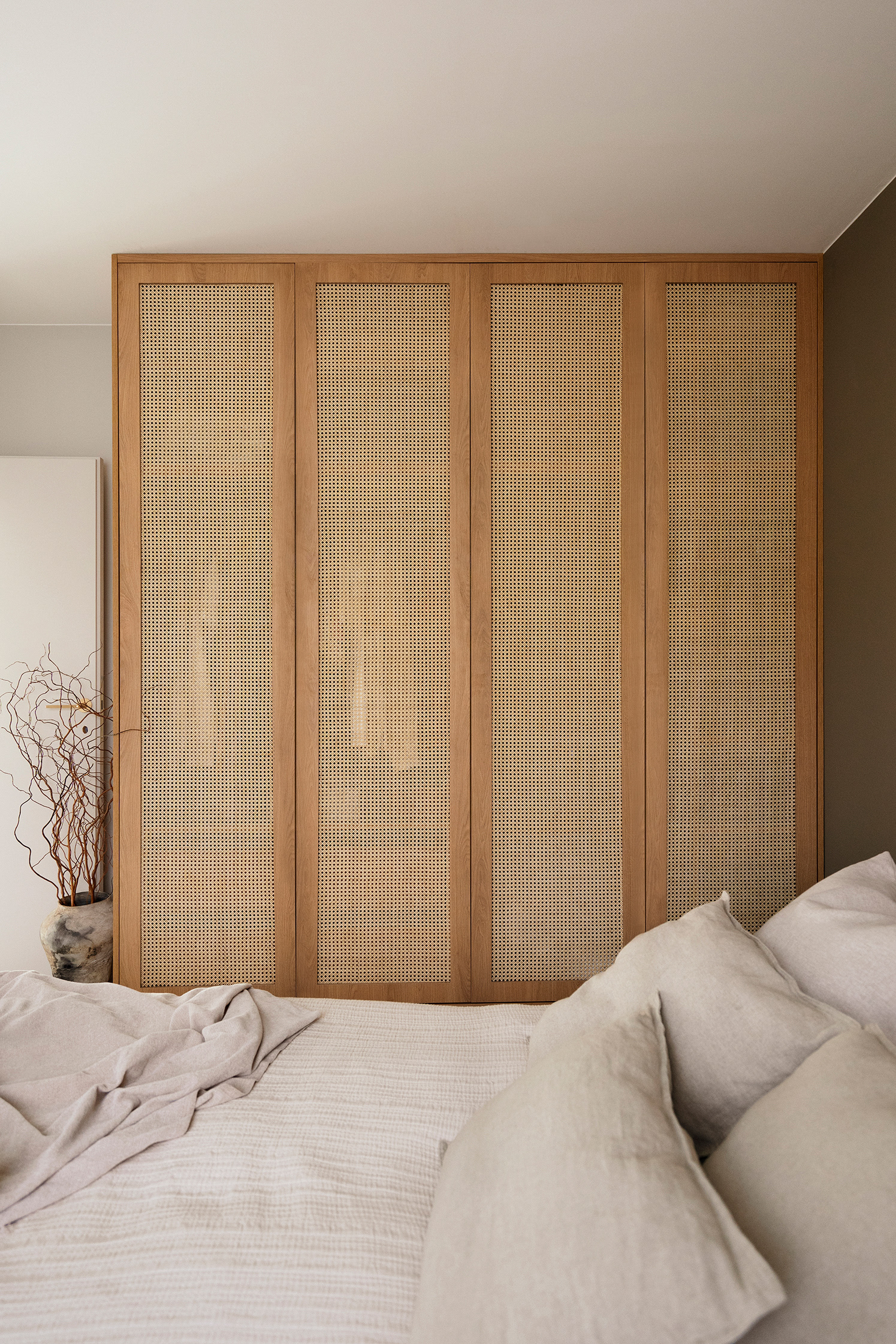 Woven cane is used as a repeating detail - on the fronts of the TV cabinet and the wardrobe in the bedroom. The bedroom itself was created as a space for rest and calm, featuring a deep chocolate-colored wall and soft textiles.
