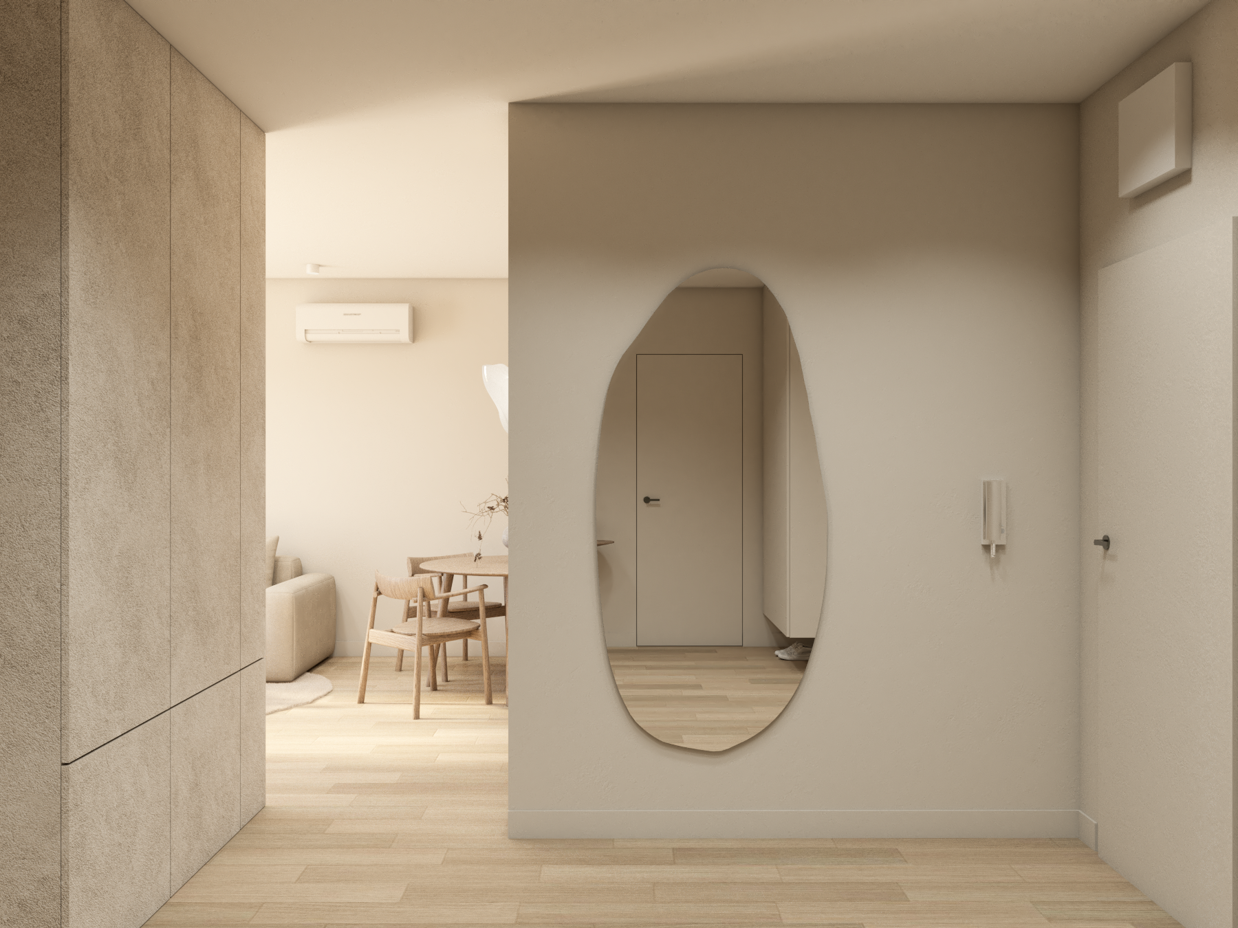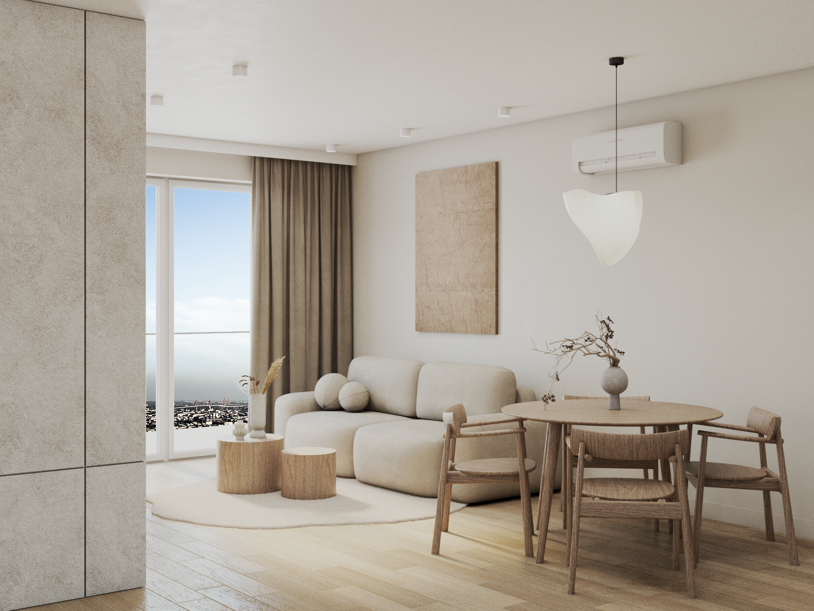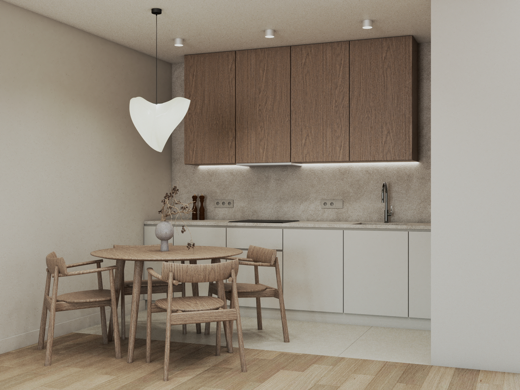 This minimalist apartment project, located in Siedlce, was designed to reflect calmness, harmony, and simplicity. The client’s vision centered around a muted, earthy color palette and natural materials — a space where the home becomes a quiet background for everyday life.